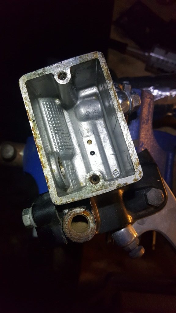 Next was cleaning the brake reservoirs, hand controls and the overall bike. The engine must have leaked oil on the left side, frame was covered in old oil. This would also explain the seized engine, most likely due to oil starvation (plus possible overheating from running too lean with no airbox and the wrong carb settings).