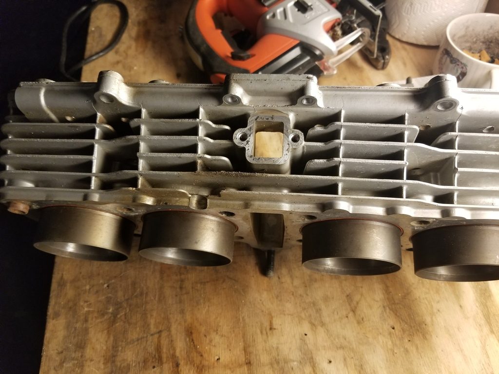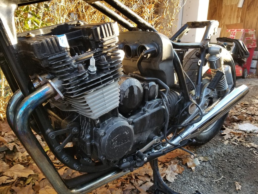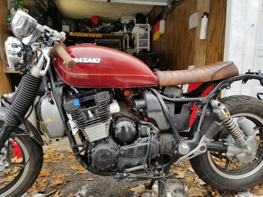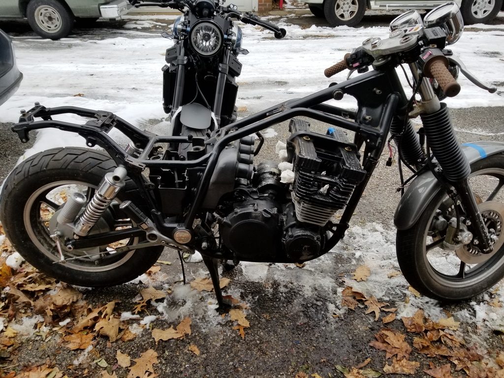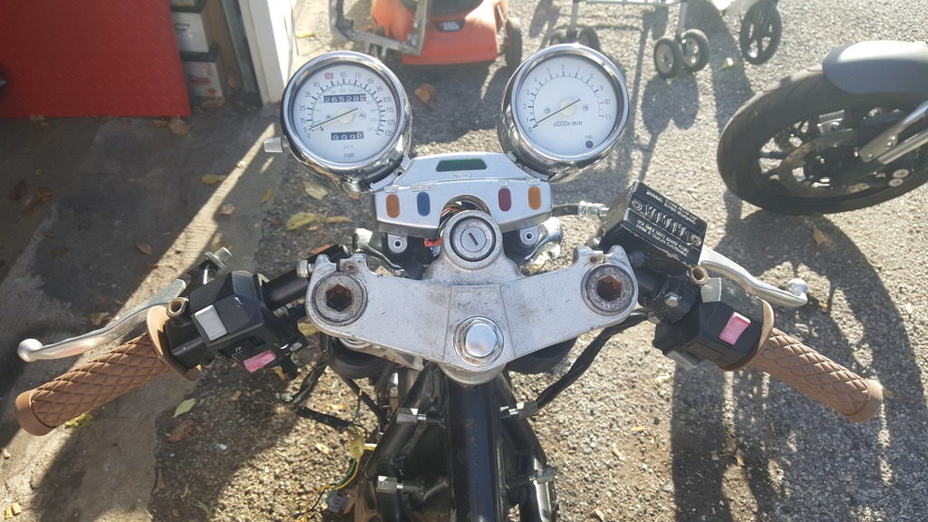 Starting the transformation beginning with a quick mockup to get an idea where I want this bike to be. Customer wants it low. I experimented with a drag bar but decided to go with clipons and therefore replaced the original top triple tree with a "flat" one off an old FZR 600. It also needs a different tank, seat and have the gauges dropped. Tank is off an 1976 KZ750 and will need some minor modifications to bolt on.