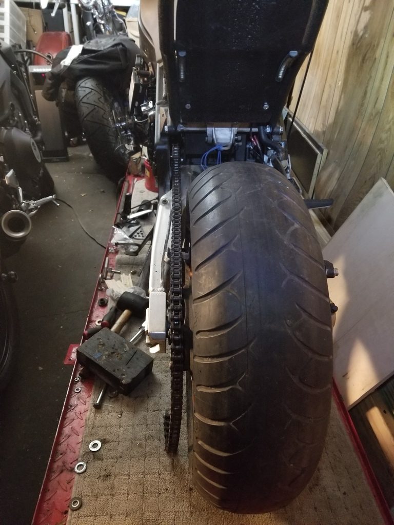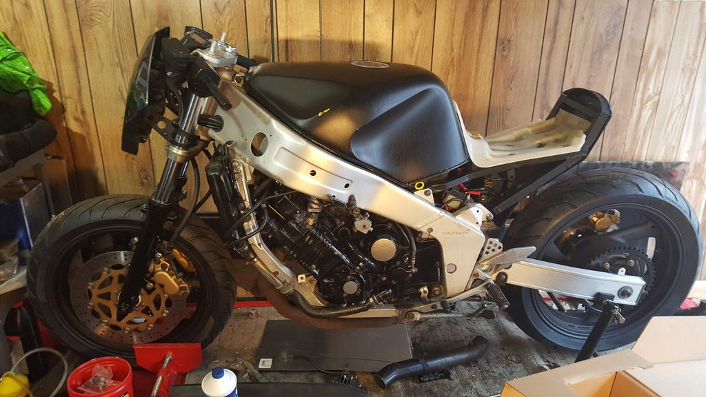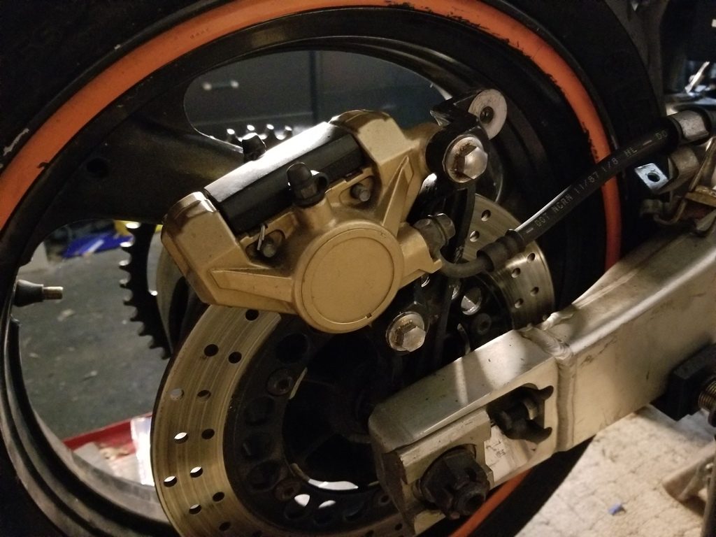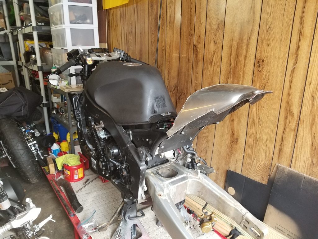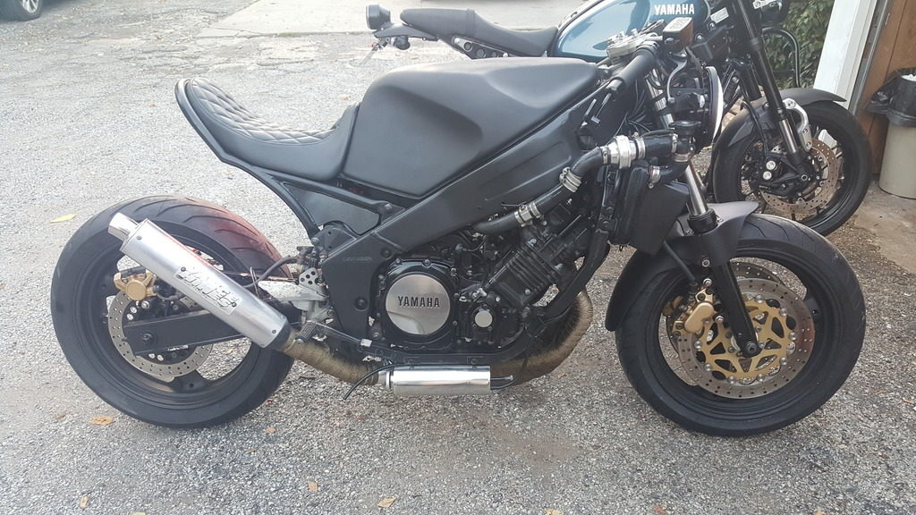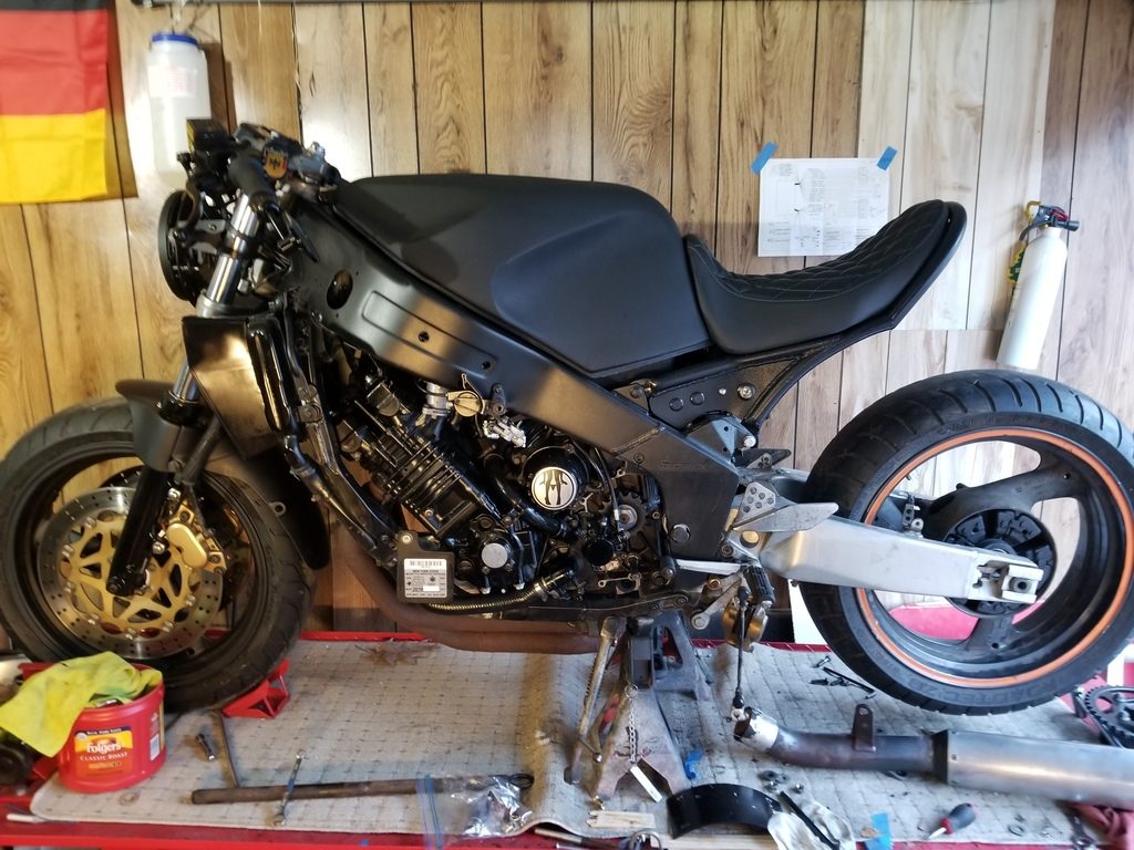I decided to put a wider rear tire on the bike. In order to do that, I had to go with a wider rim. The wheel of choice is off a 94 FZR 1000 because the spokes design is the same. It is also a 17 inch which offers a better tire selection. After one first test fit, I realized that the stock swingarm might work. However, I am swapping it for a 92 FZR swingarm for less modifications and a beefier look.