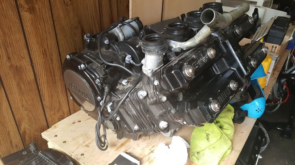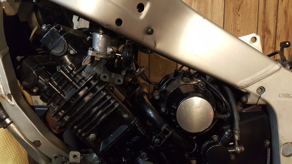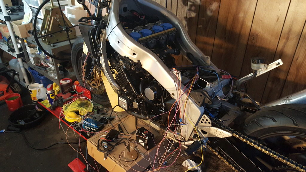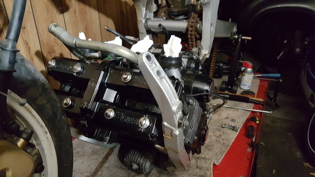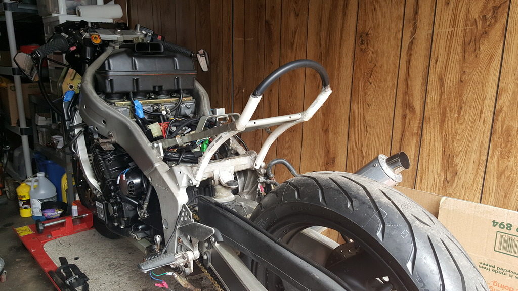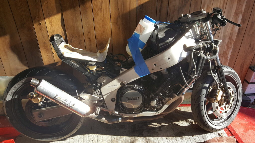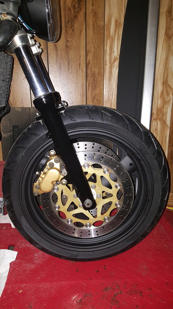 I decided to put a wider rear tire on the bike. In order to do that, I had to go with a wider rim. The wheel of choice is off a 94 FZR 1000 because the spokes design is the same. It is also a 17 inch which offers a better tire selection. After one first test fit, I realized that the stock swingarm might work. However, I am swapping it for a 92 FZR swingarm for less modifications and a beefier look.