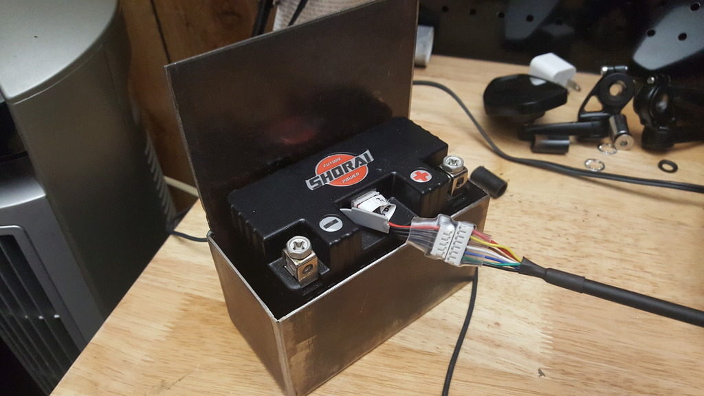 Wiring... I decided to do that from scratch to make sure all wiring is updated and to get rid of fuses. I am using the Motogadget M-Unit as well as their wiring kit which is color coded for easier identification. For handlebar controls, I am using Motogadget push button minis. The headlight halo is wired to an on/off switch and can be operated separately. Battery is a Shorai, the digital gauge is a TrailTec.