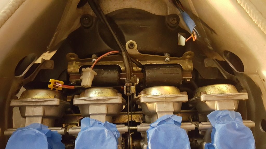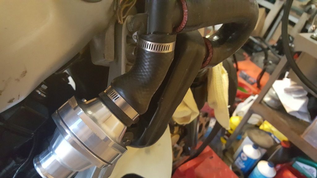 The original bike setup has full fairings which cover things like ignition coils that are originally placed outside the frame as well as a bulky thermostat housing. Going naked with this bike required to move the ignition coils and remove the thermostat housing. In order to make room for ignition coils inside the frame, I decided to reroute the coolant pipes, which originally go up the engine and exit the frame top right. My new set up has the coolant pipes exit the engine towards the rear and go up the frame on the outside. This gives me room to put the ignition coils where the coolant pipe used to be. An new inline thermostat housing with correct opening temperature setting completes the setup. It is still not ideal and I am planning to replace the radiator with one that has an inbuilt cap and entry on bike side, not facing forward as it is at the moment.