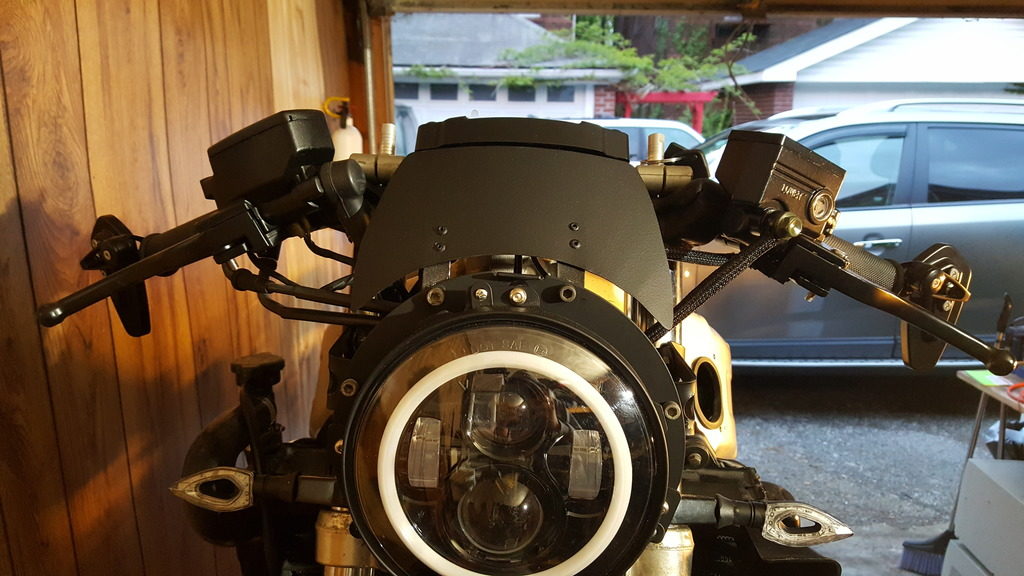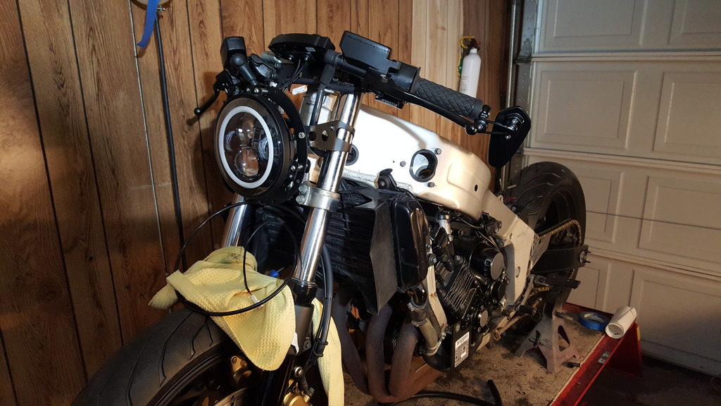 Headlight... The right headlight is very important for the looks of a bike, at least to me. I was looking for one that sits flush and doesn't stick out much. It took me several attempts and lamps to find the right one. Here a few pics of my selection process.