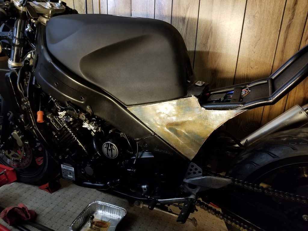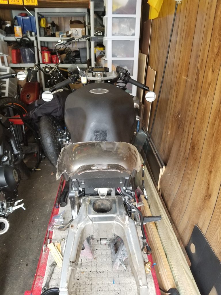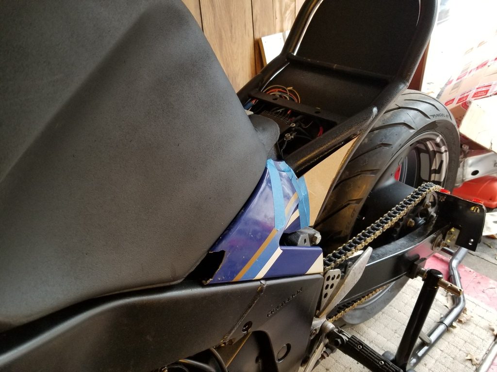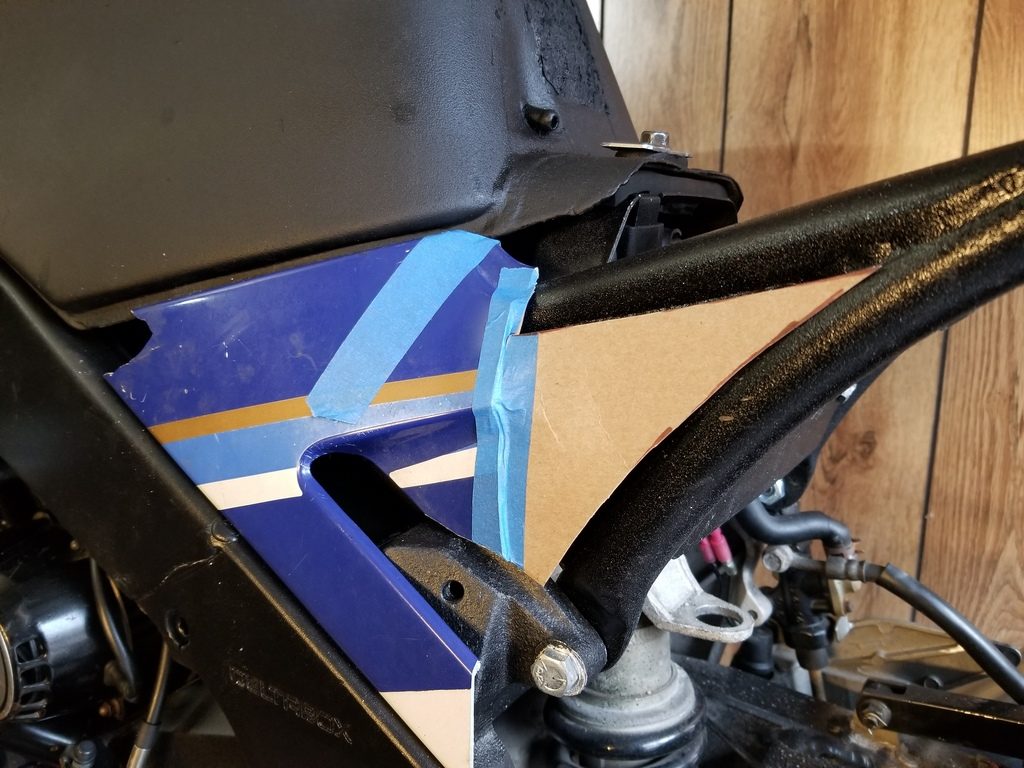 I believe that the bike would look cleaner with side covers. Here a few pics of the process. I started with the original side cover and cut it. This gives me a template for the somewhat difficult shape. Next up was adding cardboard to mock up the entire cover. I am going with fiberglass for now but will most likely build it out of metal at some point in the future.